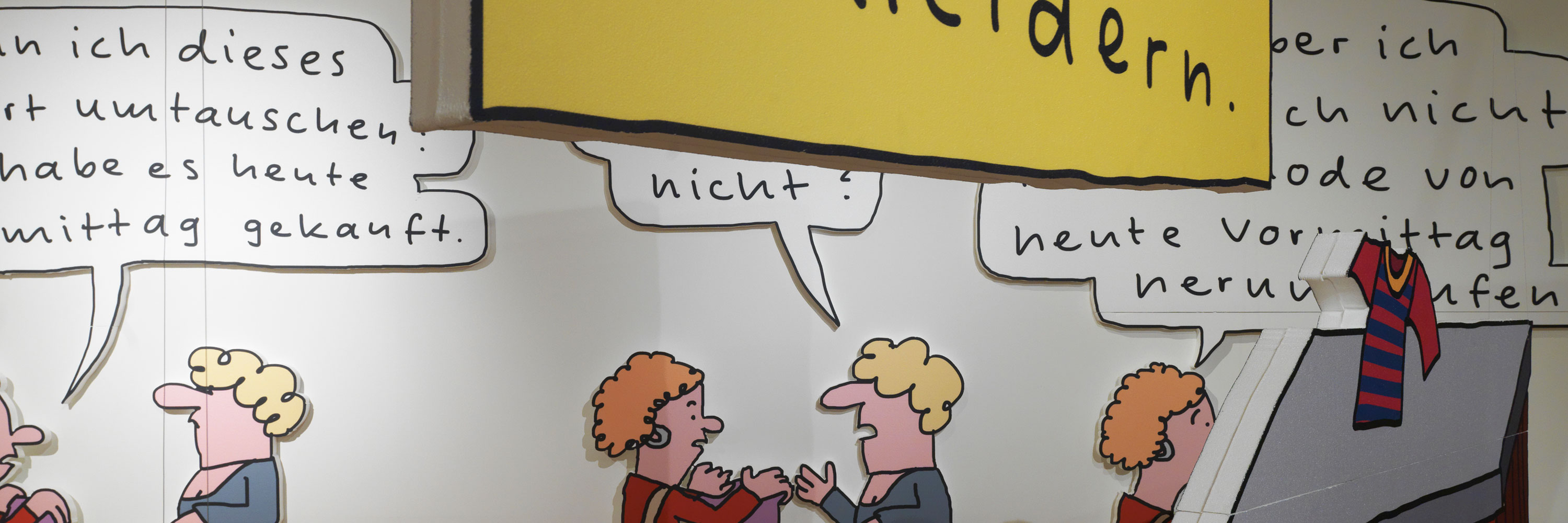 Als Reaktion auf die Missstände der Fast Fashion formierte sich in den vergangenen Jahren die Slow Fashion-Bewegung. Bei näherer Betrachtung zeigt sich jedoch, dass es keine einfachen und schnellen Lösungen für eine komplexe globale Problematik geben kann. Und so sieht sich der Konsument auf seiner Suche nach ökologisch und ethisch korrekter Mode vielerlei Tücke ausgesetzt, die der Schweizer Cartoonist Ruedi Widmer in der Ausstellung mit gewohnt spitzer Feder thematisiert.