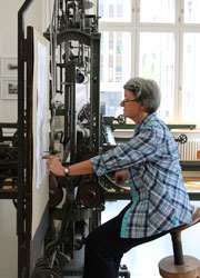 Die funktionsfähige Handstickmaschine aus dem Jahr 1890 ist ein Highlight des Textilmuseums. Hier arbeitet Maria Weber, eine der wenigen Personen in der Ostschweiz, die die komplexe Bedienung der einst weit verbreiteten Maschine noch beherrschen. In Betrieb genommen wird die ehemalige Schulmaschine jeweils am Donnerstag- und Freitagnachmittag von 12.30 Uhr bis 17 Uhr sowie zu den unten angegebenen Terminen.